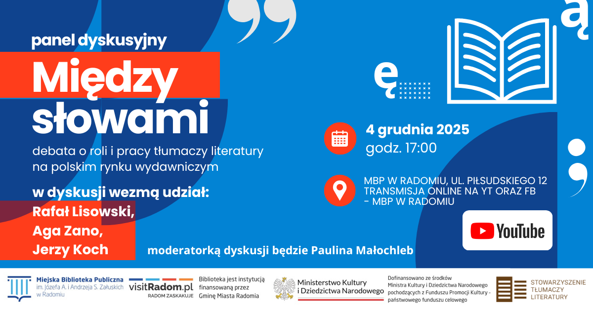 WWW.MBPRADOM.PL – kopia (1364 x 240 mm) (240 x 136.4 mm)RKKnarodowy program grafika571790190_1256734013148374_3013311526163737765_nBez nazwy (Reklama na Facebooka) (2)F1-27.11.2025biblioteka-bez-granic-na www Wydarzenia Aktualności Radomska Karta Kulturalna Radomski Klub Czytelniczy Radomskie ławeczki literackie CZYTAKI DLA OSÓB NIEWIDOMYCH I SŁABOWIDZĄCYCH CZYTAKI DLA OSÓB NIEWIDOMYCH I SŁABOWIDZĄCYCH CZYTAKI DLA OSÓB NIEWIDOMYCH I SŁABOWIDZĄCYCH ZASUGERUJ KUPNO KSIĄŻKI ZAPISZ SIĘ DO NEWSLETTERA Email Przechodząc dalej, akceptujesz politykę prywatności Klauzula informacyjna o przetwarzaniu danych osobowych Zgodnie z art. 13 i 14 Rozporządzenia Parlamentu Europejskiego i Rady (UE) 2016/679 z dnia 27 kwietnia 2016 r. w sprawie ochrony osób fizycznych w związku z przetwarzaniem danych osobowych i w sprawie swobodnego przepływu takich danych oraz uchylenia dyrektywy 95/46/WE (ogólne rozporządzenie o ochronie danych), informuję, że:Miejska Biblioteka Publiczna im. Józefa A. i Andrzeja S. Załuskich w Radomiu, z siedzibą przy ul. J. Piłsudskiego 12, W sprawach związanych z ochroną danych osobowych wyjaśnień udziela Inspektor Ochrony Danych, pod adresem e-mail: iod@mbpradom.pl. Biblioteka działając na podstawie Art. 6 ust.1 lit. a) RODO, zbiera adresy e-mail, w celu przesyłania informacji promocyjnych, po uprzednim wyrażeniu zgody na ich otrzymywanie. Każdy użytkownik Newslettera ma prawo dostępu do treści swoich danych, do ich sprostowania, ograniczenia usunięcia danych, przenoszenia danych oraz wniesienia sprzeciwu wobec ich przetwarzania. Podanie danych jest dobrowolne, jednakże niezbędne do korzystania z kanału Newsletter. Dane osobowe użytkowników Newsletter będą przechowywane jedynie w okresie niezbędnym do spełnienia celu, dla którego zostały zebrane. Okres przechowywania danych osobowych w postaci adresów e-mail wynosi 90 dni od momentu rezygnacji z subskrypcji Newslettera. W przypadku wyrażenia zgody na wykorzystanie przez Bibliotekę adresu e-mail, użytkownik Newslettera ma prawo do jej wycofania w dowolnym momencie, bez wpływu na zgodność z prawem przetwarzania, którego dokonano na podstawie zgody przed jej cofnięciem. Biblioteka udostępnia dane osobowe podmiotom upoważnionym na podstawie przepisów prawa. Dane osobowe użytkowników Newslettera nie będą przetwarzane w sposób zautomatyzowany i nie będą profilowane. Każdy użytkownik Newslettera ma prawo do wniesienia skargi do Prezesa Urzędu Ochrony Danych Osobowych, z siedzibą w Warszawie przy ul. Moniuszki 1A. Zgoda na przetwarzanie danych osobowych Rejestrując się w Newsletter wyrażam zgodę na przetwarzanie moich danych osobowych w postaci adresu e-mail przez Miejską Bibliotekę Publiczną im. Józefa A. i Andrzeja S. Załuskich w Radomiu, z siedzibą przy ul. Józefa Piłsudskiego 12, 26-600 Radom.